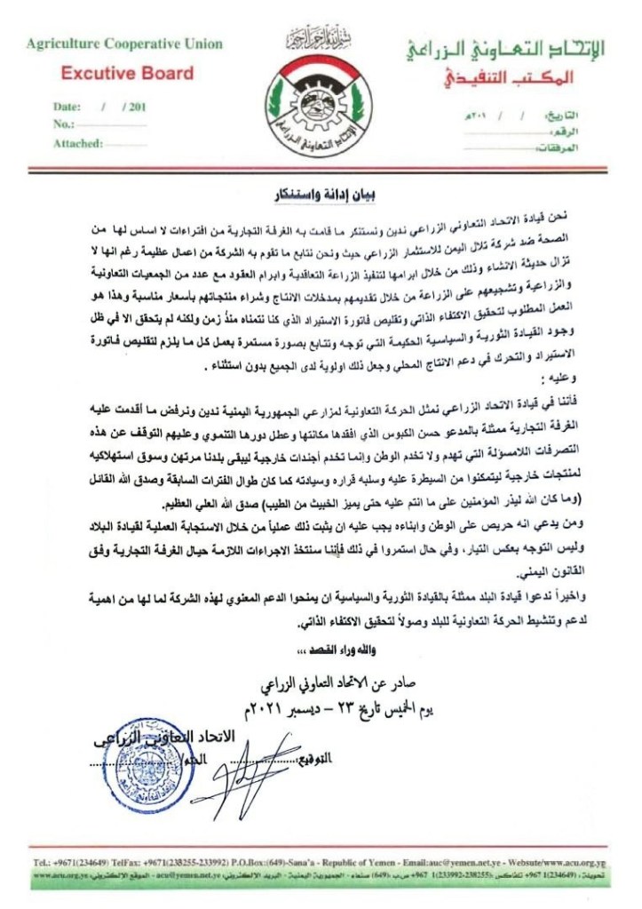 أدان الإتحاد التعاوني الزراعي الممارسات التعسفية للغرفة التجارية بأمانة العاصمة وما قامت به الغرفة من افتراءات لا أساس لها من الصحة ضد شركة تلال اليمن للاستثمار الزراعي.