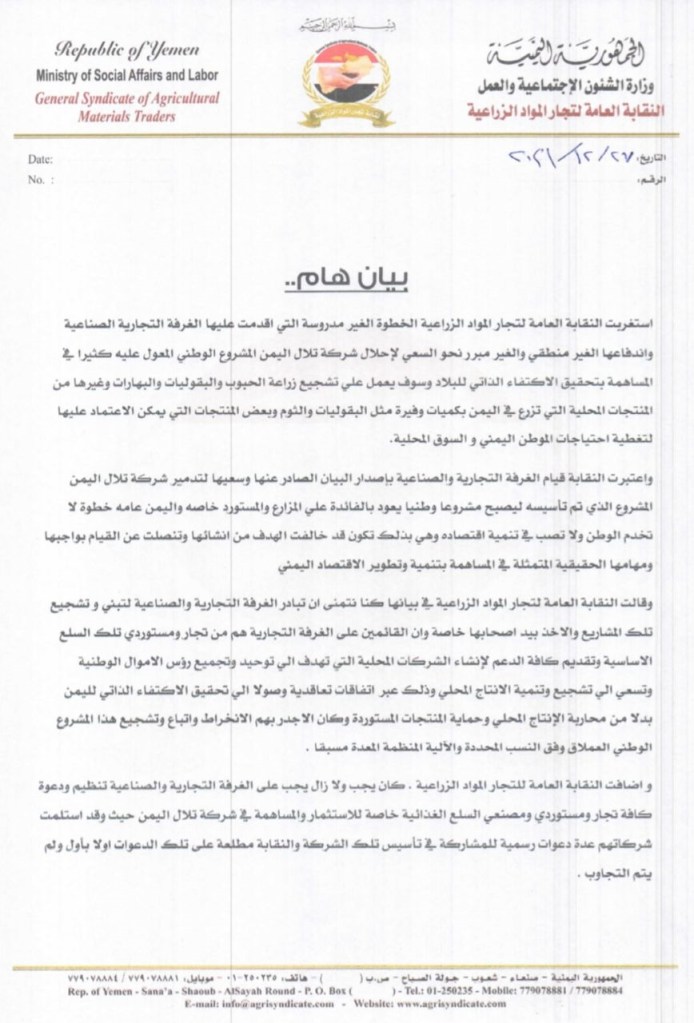 استغربت النقابة العامه لتجار المواد الزراعية الخطوة الغير مدروسه التي اقدمت عليها الغرفة التجارية الصناعية واندفاعها الغير منطقي والغير مبرر نحو السعي لآحلال شركة تلال اليمن المشروع الوطني المعول عليه كثيرا في المساهمه بتحقيق الاكتفاء الذاتي للبلاد وسوف يعمل علي تشجيع زراعة الحبوب والبقوليات والبهارات وغيرها من المنتجات المحلية التي تزرع في اليمن بكميات وفيرة مثل البقوليات والثوم وبعض المنتجات التي يمكن الاعتماد عليها لتغطية احتياجات الموطن اليمني و السوق المحليه.
