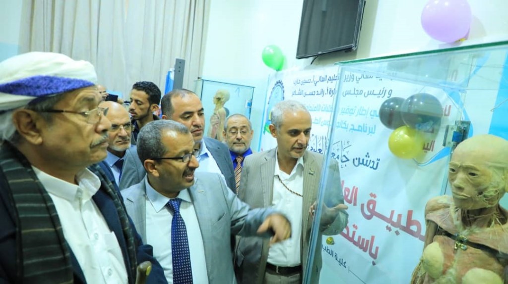 واستمع وزير التعليم العالي والزائرون إلى ايضاح من قبل رئيس الجامعة الدكتور عادل المتوكل وعميد كلية الطب والعلوم الصحية الدكتور عبدالله المخلافي إلى ايضاح حول أهمية تدشين التطبيق العملي في معمل التشريح بما يكفل تجويد العملية التعليمية والتطبيقية وفي إطار تلبية متطلبات الاعتماد الأكاديمي لبرنامج بكالوريوس الطب والجراحة “.